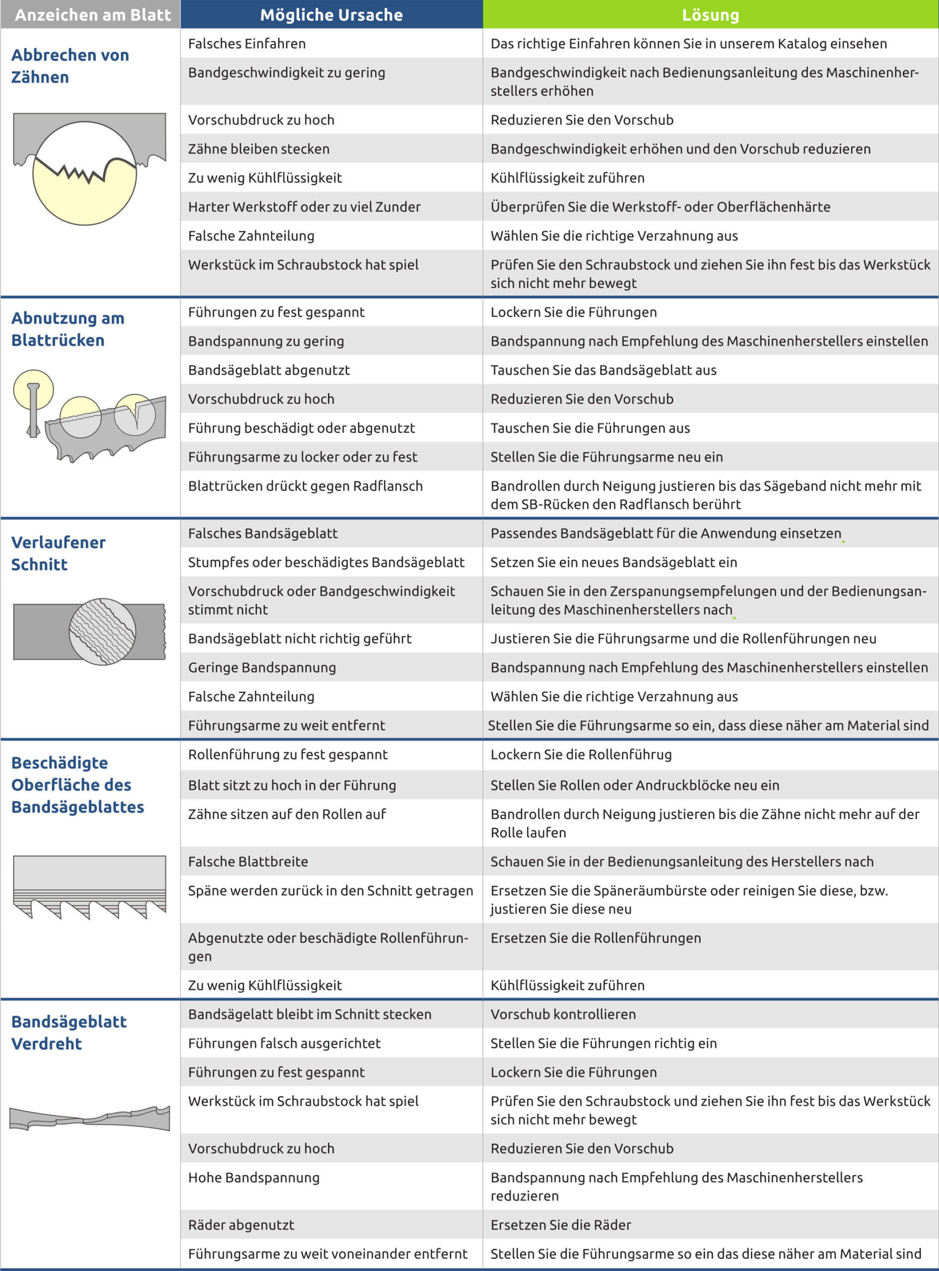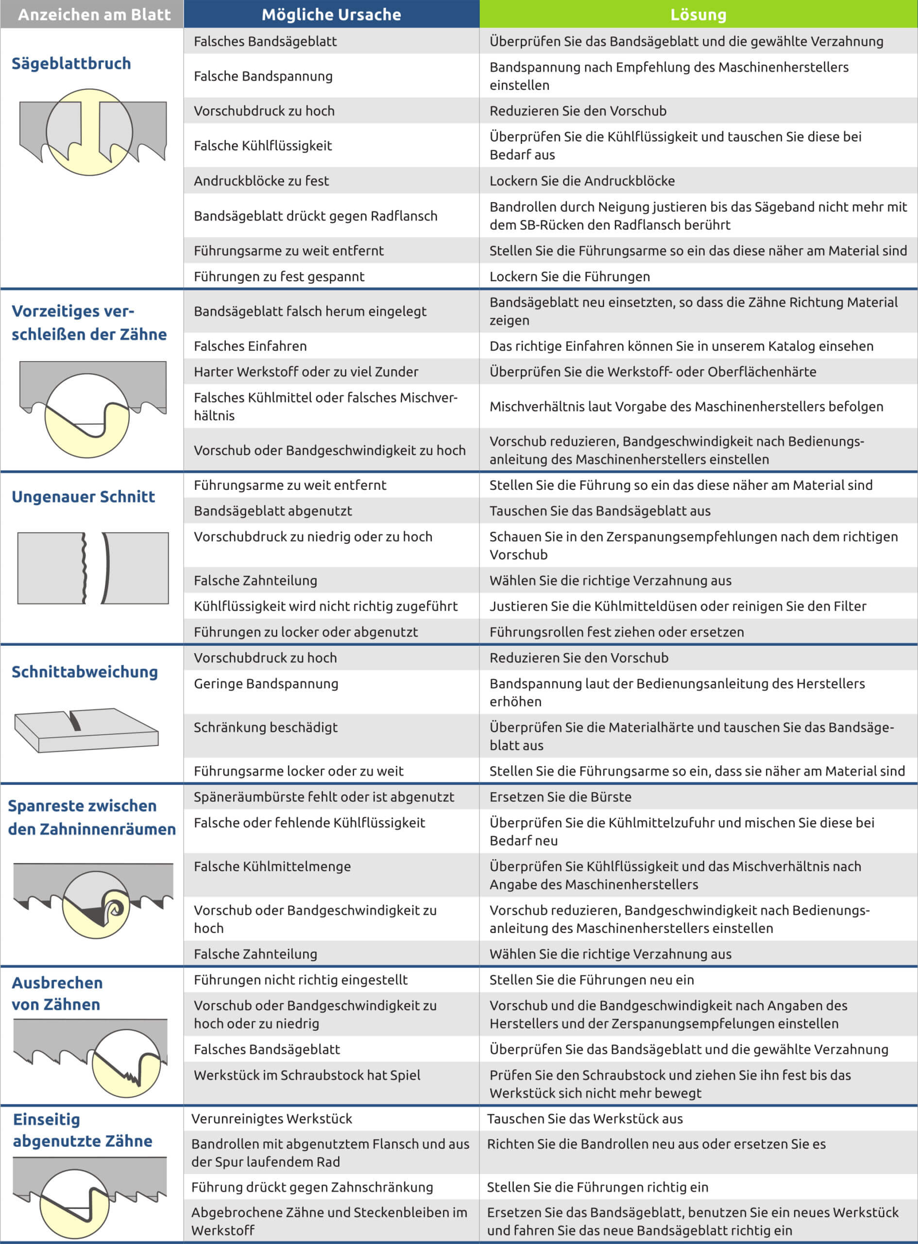 Mensch, Maschine, Werkstoff und Sägeband müssen ein auf sich abgestimmtes System bilden. Dabei steuert der Bediener die Maschine und kann somit erheblichen Einfluss auf Leistung und Sägeergebnis nehmen. In diesem Zusammenhang gilt es, mögliche Ausfallgründe und deren Ursachen zu kennen, um wirksame Gegenmaßnahmen zur Beseitigung zu schaffen.