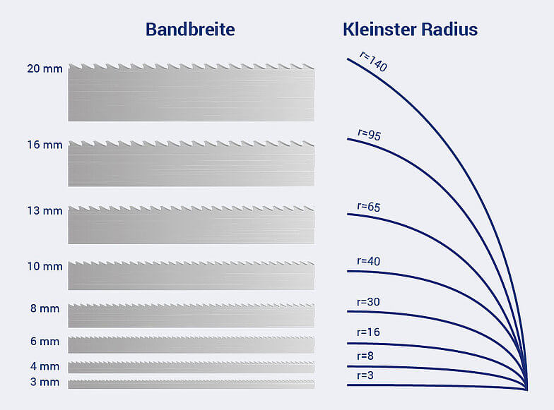 - Bei Konturensägen bestimmt der kleinste zu sägende Radius die Bandbreite.