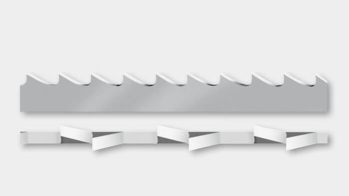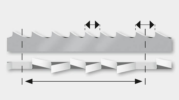 Eine exakte Schränkung ist ausschlaggebend für eine optimale Schnittleistung. Durch die Schränkung, bei der die Zähne abwechselnd links und rechts über die Ebene des Bandkörpers hinausragen, ergibt sich der korrekte Freischnitt. Dies verhindert das Einklemmen des Bandes.